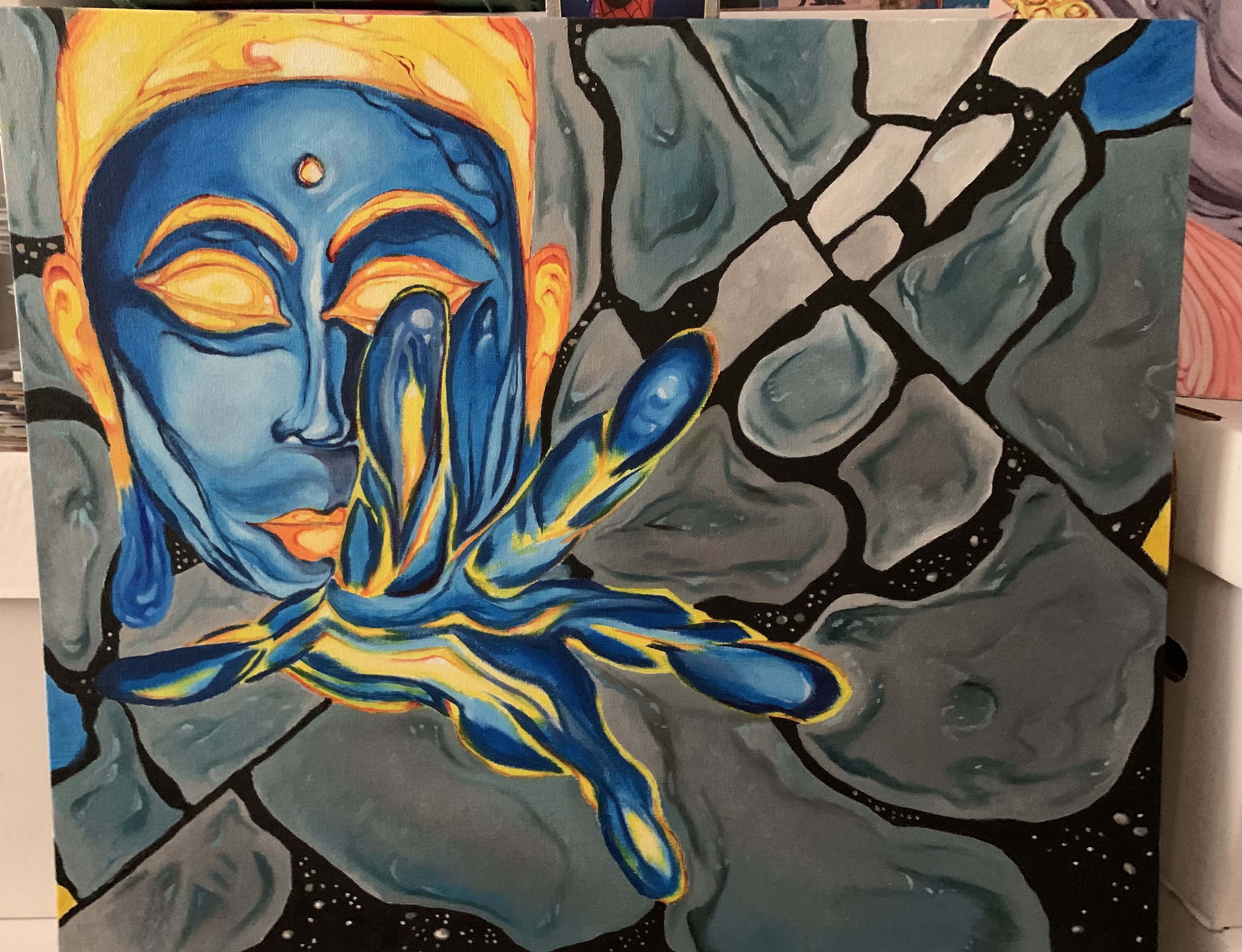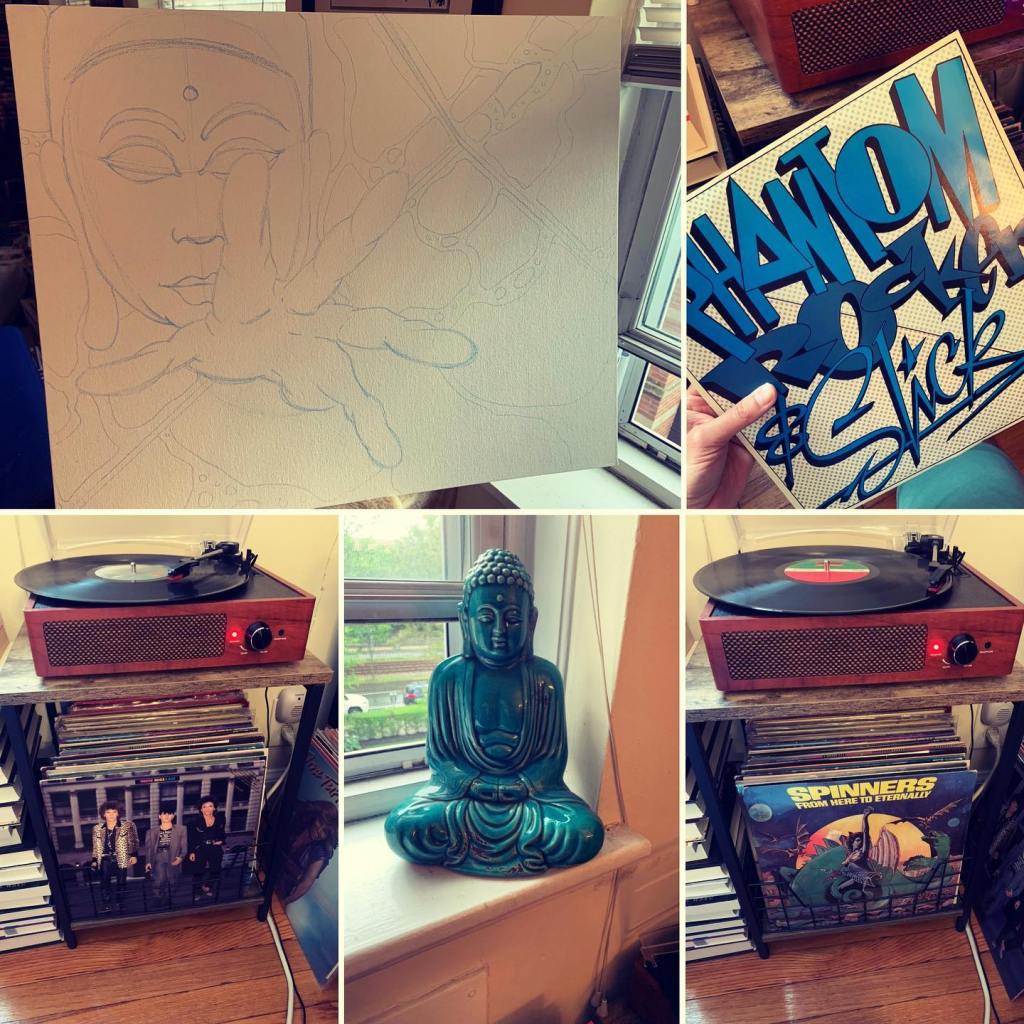 Meanwhile, it took me a lot longer to sketch out this 20×24 oil painting on canvas board. I’d been rereading a lot of X-Men. This went from an image of a robotic Sentinel to a mystical statue ala Ray Harryhausen. It’s also inspired by Tina Turner’s admitted ‘salvation’ from struggles through Buddhism. I’m hoping viewers will make their own story with the final piece. I’ve included the two albums I was listening to that helped me work through this initial process. Music is my fuel and I can’t explain its importance while I create.