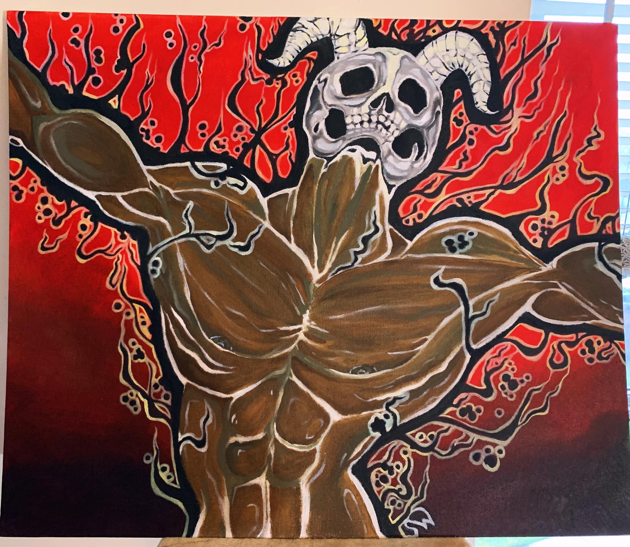 Completed! “Genesis: Pagan-X”, oil painting on Bristol board, 20”x24”. Inspired by, in no particular order, “The Garden of Earthly Delights” by Hieronymus Bosch, Blue Devil, the Friday the 13th franchise, Ghost Rider, Etrigan the Demon, Lady Death, and the X-Men. I started this in October and finished today in December.