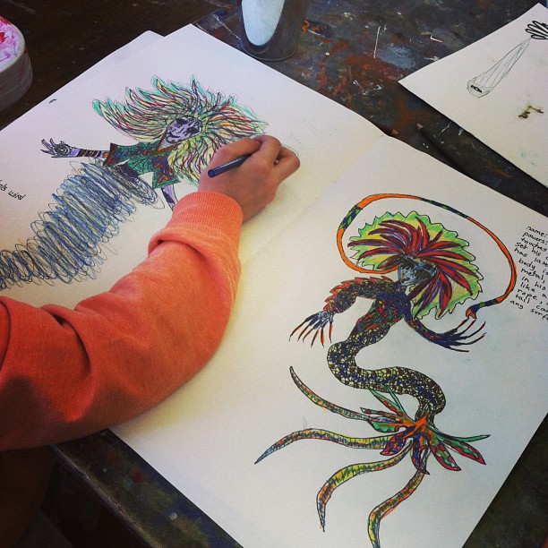 papier-mâché (head), clear tape & saran wrap (spine), wooden frames (body), sequined fabric (skin), mirrors, and other medium.